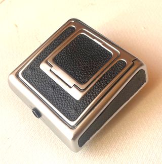 Pozzetto per fotocamera Pentacon Six TL. - Design in pelle nera e metallo. - Forma quadrata con finiture metalliche.