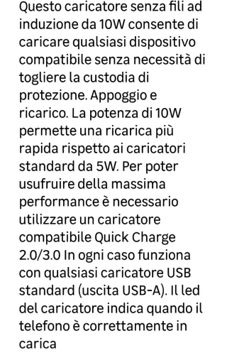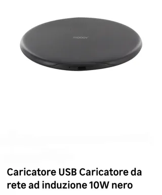 Caricatore da rete ad induzione di colore nero. - Potenza 10W. - Ingresso USB.