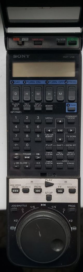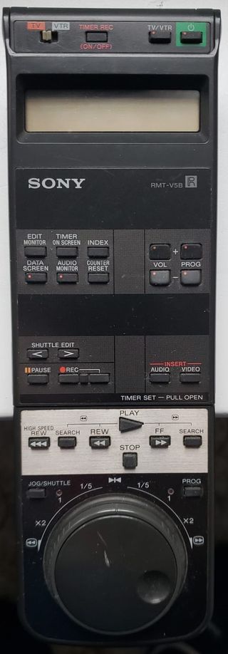 Vendo Telecomando Remote Control videoregistratore Sony RMT-V5B Telecomando videoregistratore Sony - Pulsanti TV/VTR, Timer Rec, TV/VTR, Power. - Display LCD. - Pulsanti Edit Monitor, Data Screen, Timer On Screen, Audio Monitor, Index, Counter Reset. - Pulsanti Vol +/-, Prog. - Pulsanti Shuttle Edit, Pause, Rec, Insert Audio/Video. - Pulsanti Play, Stop, Rew, FF, Search.