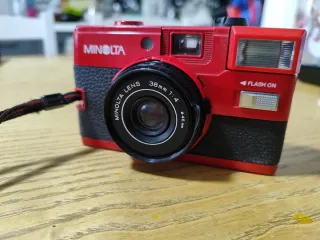 Fotocamera compatta Minolta HI-MATIC GF, un classico per gli amanti della fotografia analogica. - Design compatto e leggero. - Colore rosso vivace. - manca la copertura per la lente - no scatola - i vetrini dove "punti l'occhio" sono un po' opachi - presenta segni di usura