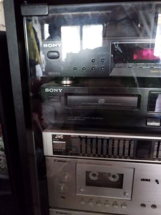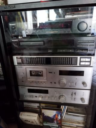 Amplificatore Lenco, piastra Lenco (si accende ma è rimasta bloccata), equalizzatore JVC, CD Sony, sintonizzatore Sony, piatto Lenco (sicuramente da sostituire i cordini). Compreso di mobile. Senza casse.