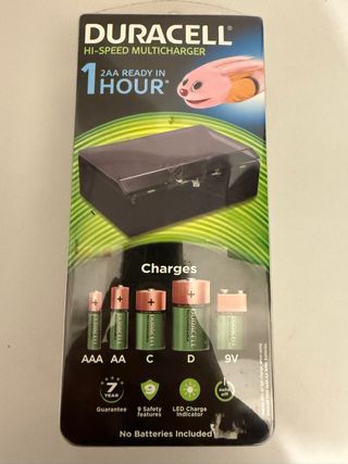 Caricabatterie Duracell Hi-Speed Multicharger, pronto in 1 ora! - Carica batterie AAA, AA, C, D e 9V. - 9 funzioni di sicurezza. - Indicatore di carica LED. - Spegnimento automatico. - Non include batterie.