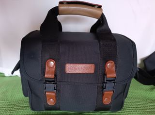 Borsa fotografica Reporter di colore nero, con manico e dettagli in pelle marrone. - Chiusura con fibbie. - Logo Reporter in rilievo.
