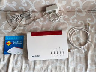 Router Fritz!Box 7590 in white and red. - Includes power adapter. - Includes network cable.