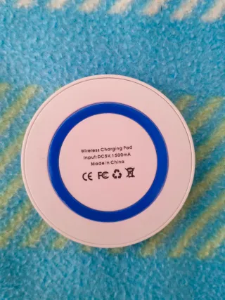 Caricatore wireless di forma rotonda, ideale per smartphone. - Design bianco con bordo blu. - Input: DC5V, 1500mA. - Certificazioni CE, FC. - Made in China.