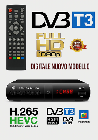 Decoder digitale terrestre DVB-T3 per la ricezione dei canali in chiaro in alta definizione. Ideale per vedere tutti i canali TV. - Compatibile con TV Full HD. - Uscita HDMI e SCART. - Supporta H.265 HEVC e H.264 MPEG-4. - Formato DVB-T3 DVB-T2 DVB-C DVB-H.