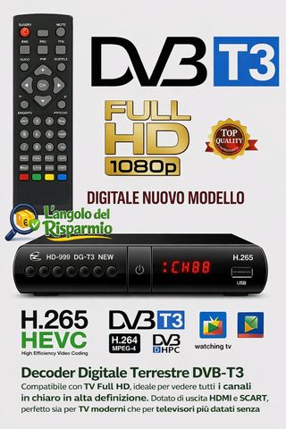 Decoder digitale terrestre per la ricezione di canali Full HD. - Supporta standard DVB-T3 e H.265 HEVC. - Uscita HDMI per alta qualità video. - Include telecomando. - Design compatto e moderno.