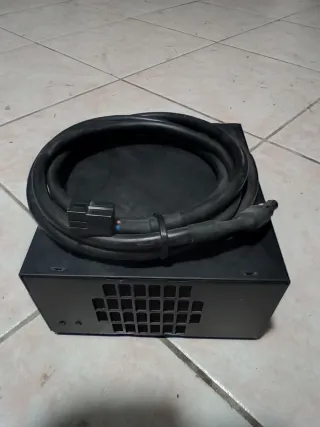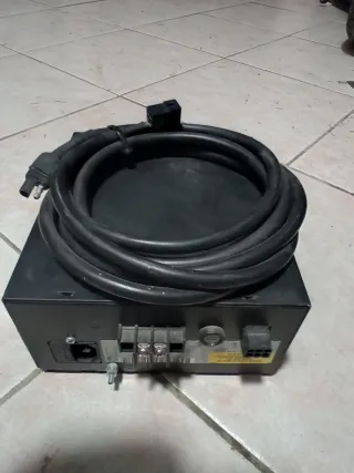 Alimentatore di marca Motorola, con cavo avvolto. - Cavo nero spesso e robusto. - Connettori multipli sul retro.