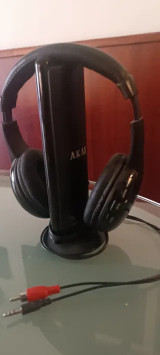 Cuffie Akai di colore nero, con cavo e connettori. - Design over-ear. - Cavo con connettore jack 3.5mm e connettori RCA rossi.