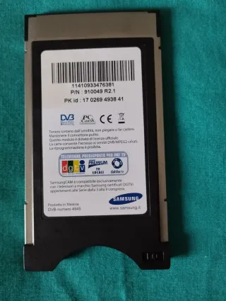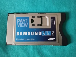 Scheda CAM 2 Pay-Per-View Samsung. - Modello: CAM 2 - Funzione: Pay-Per-View - Marca: Samsung Permette la ricezione di canali digitali terrestri e satellitari pay-per-view direttamente sulla TV senza un decoder esterno. Evita l'uso di cavi aggiuntivi e il disordine di un decoder separato.