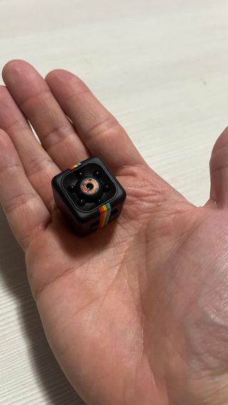 Piccola videocamera di forma cubica. Presenta dettagli colorati sul lato. - Design compatto e discreto. - Finitura nera lucida. - risoluzione full HD 1920x 1080