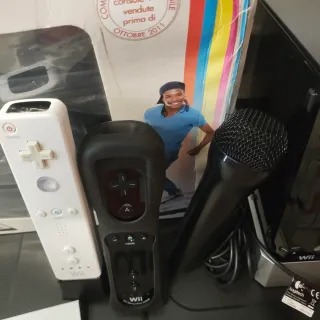 Nintendo wii completissima. Solo da collegare e divertirsi con amici e parenti. - 2 controller, 2 nunchack, - balance board, microfono, 2 tappetini, zumba pesi - cavo tv, alimentatore, barra sensore 8 giochi: wii fit, wii fit plus, zumba, wii sport resort, sing 4, pro evolution soccer, we dance, kawasaki quad bikes Bikes.
