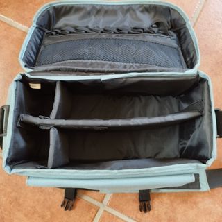 Borsa di colore grigio azzurro, ben imbottita, munita di maniglia, due cinghie di chiusura e tracolla regolabile con imbottitura per spalla stesso colore della borsa. Tre capienti tasche con chiusura a strappo (velcro): una anteriore e due laterali. Lo spazio interno può essere regolato tramite divisori imbottiti posizionabili con sistema a strappo. Sul lato inferiore del coperchio 3 piccole tasche a rete e 8 alloggiamenti estensibili per accessori aggiuntivi. Dimensioni interne: Lunghezza: 35 cm Altezza: 20 cm Profondità: 15 cm