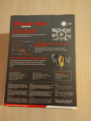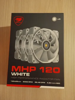 Set di tre ventole Cougar MHP 120. Il connettore per la scheda madre è 4 pin. Non sono RGB. Mai aperte o usate, mi hanno venduto il modello sbagliato senza reso. Chiedete per altre informazioni. - Colore: Bianco - Dimensioni: 120x25mm - Velocità: 2000 RPM - Flusso d'aria: 82.48 CFM - Pressione statica: 4.24 mm-H2O
