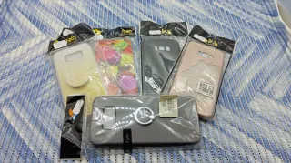 Set di 5 pezzi cover per Samsung S8 Plus. - Cover con fantasia di macaron colorati. - Cover glitterata color oro. - Cover nera. - Cover rosa con disegno di tigre. - Cover grigia con anello porta-dita.