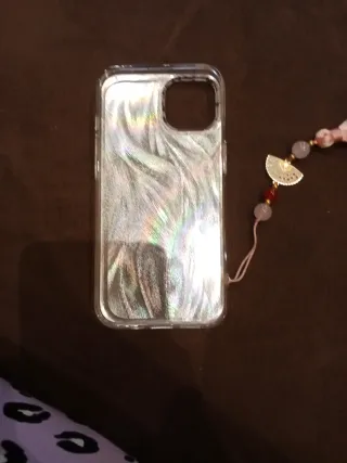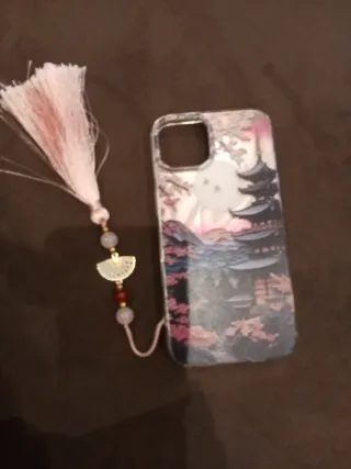 Cover per iPhone 14 con un grazioso ciondolo a tema orientale. - Design con paesaggio e pagoda. - Ciondolo con nappa e ventaglio. - Perfeziono le condizioni.