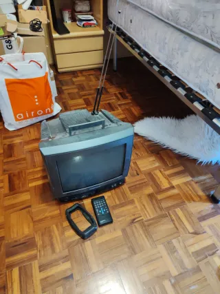 Televisore Grundig con finiture nere e grigie. - Telecomando incluso. - Maniglia per il trasporto.