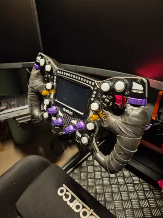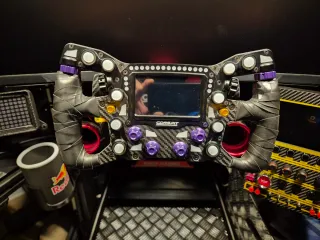 Volante CONSPIT MAX 01 per simulazione di guida. - Design in fibra di carbonio. - Rivestimento in similpelle nera. - Pulsanti e manopole viola. - Display centrale. - Leve rosse. - Impugnature personalizzate con nastro nero. Vendo stupendo volante CONSPIT MAX 01 COME NUOVO Protezioni alle impugnature messe dal primo giorno quindi praticamente nuove Nessun problema Scatola originale 10 mesi di vita e garanzia italiana