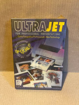 Confezione di carta fotografica Ultra Jet formato A5, ideale per presentazioni professionali. - 50 fogli inclusi. - Grammatura 260 gm². - Risoluzione 720/1440 dpi. - Idroresistente.