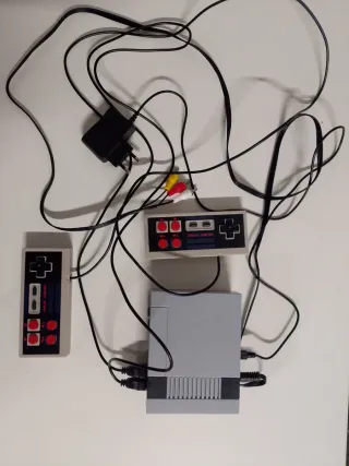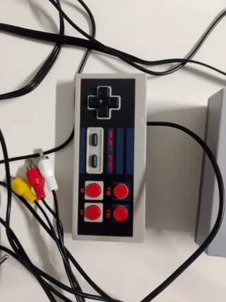 Console per videogiochi retrò con controller. - Console grigia. - Due controller inclusi. - Cavi di collegamento inclusi.