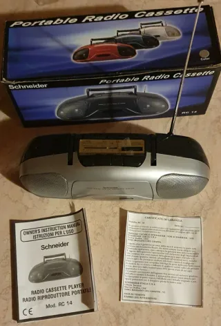 Radio cassette portatile Schneider, modello RC 14. Perfetta per ascoltare la radio o le tue cassette preferite. - Design compatto e maneggevole. - Antenna telescopica per una ricezione ottimale. - Include manuale d'istruzioni e scatola originale.