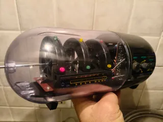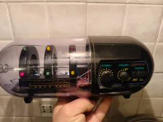 Radio vintage Cosmostar degli anni '80, con un design unico e trasparente che lascia intravedere i componenti interni.ha una piccolo taglio sulla capsula e si sente basso. - Design futuristico e colorato. - Manopole per Tuning e Volume. - Selettore di funzione. - Scala di frequenza visibile.
