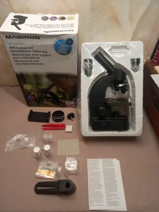 Microscopio MAGINON MK-800SH con soporte para smartphone. - Incluye accesorios para empezar a usarlo. - Ideal para iniciarse en la observación. - Incluye manual de instrucciones.