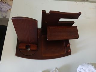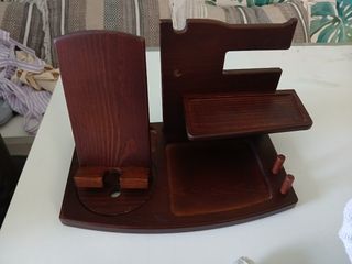 Bellissimo organizer da scrivania in legno, perfetto per tenere in ordine telefono, smartwatch e altri oggetti. - Realizzato in legno pregiato di colore marrone scuro. - Design elegante e funzionale. - Include scomparti per telefono, smartwatch e altri accessori. - Perfetto per la casa o l'ufficio.