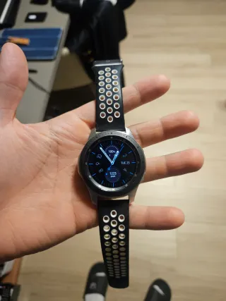 Orologio Samsung Galaxy Watch con cassa da 46mm. - Quadrante rotondo. - Cinturino con fori. - Lunetta girevole. - base di ricarica