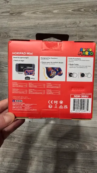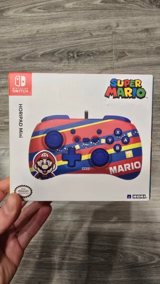 Controller HORIPAD Mini della serie Super Mario. - Design ispirato a Super Mario. - Colori rosso, blu e giallo. - Immagine di Mario sul controller.