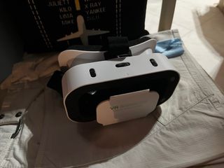 Visore per esperienze immersive in realtà virtuale. - Design bianco. - Cinghia regolabile per un comfort ottimale. - Lenti per la visione 3D.