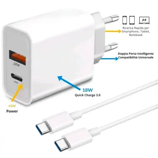 Caricatore Rapido USB-C Due Porte 45W + Cavo 1mt
