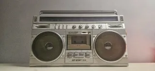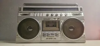Iconico boombox Sharp GF-8787, un clásico de los años 80. - Diseño robusto y compacto. - Altavoces de gran tamaño para un sonido potente. - Compartimento para cassette. - Sintonizador de radio.