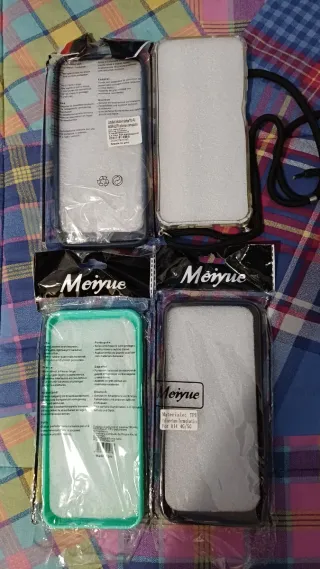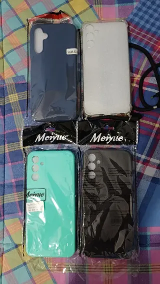 Set di cover protettive per smartphone. - Cover blu scuro - Cover trasparente - Cover verde acqua - Cover nera Vendo per spazio e inutilizzo cover Samsung A14 nuove ancora impacchettate La cover nera è per un Redmi 13C Il prezzo è di 2 euro per articolo Per qualsiasi informazione contattatemi