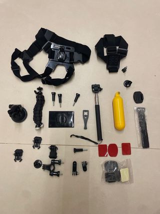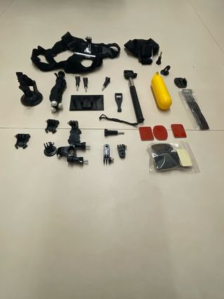 Set di accessori per action cam GoPro, ideale per diverse attività. - Supporto da petto con cinghie regolabili. - Supporto da testa con cinghie regolabili. - Mini treppiede flessibile. - Ventosa per superfici lisce. - Asta telescopica. - Custodia gialla impermeabile. - Vari supporti e adattatori. - Adesivi . - Chiave di montaggio.