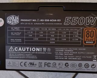 Alimentatore Cooler Master GX 550W Bronze in ottime condizioni. - Modello: GX 550W - Certificazione 80 PLUS Bronze - Potenza: 550W - Include tutti i cavi