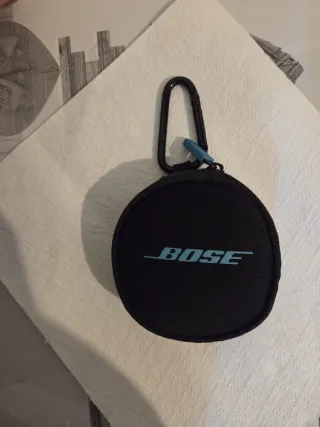 cuffie Bose con custodia e cavo di ricarica. - Custodia protettiva nera con logo Bose. - Cuffie auricolari blu. - Cavo di ricarica USB incluso. - Accessori per auricolari di diverse misure.