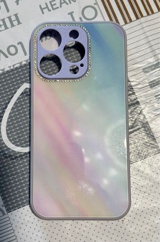Cover per iPhone 14 Pro con un design sfumato nei toni pastello, impreziosito da un bordo decorato con strass. - Finitura iridescente e colorata. - Protezione per le fotocamere con dettagli scintillanti.