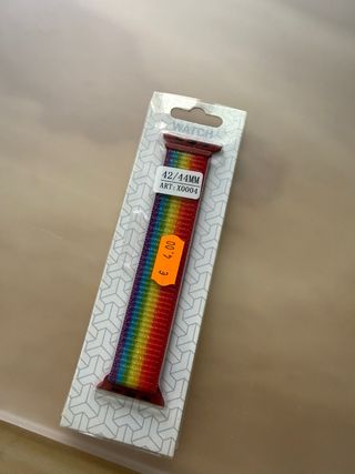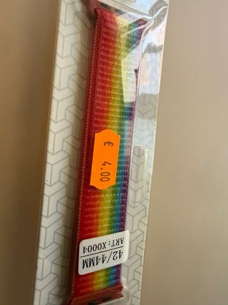 Cinturino in tessuto per Apple Watch, con un design a righe arcobaleno. - Compatibile con modelli da 42/44mm. - Chiusura regolabile.