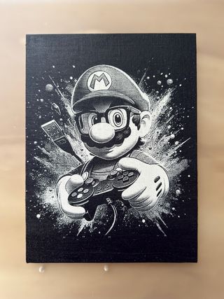 Stampa su tela di Super Mario, con un design inciso al laser su sfondo nero. - Stampa su tela. - Design inciso al laser. - Personaggio: Super Mario. - 18x24 cm