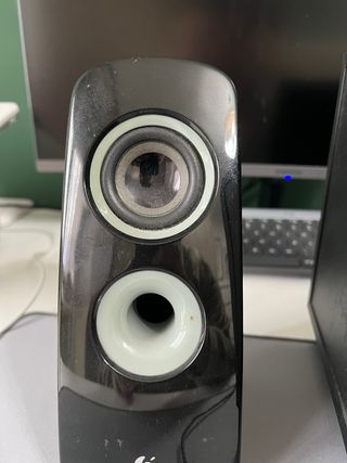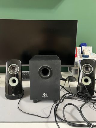 Sistema di altoparlanti Logitech composto da due satelliti e un subwoofer. - Design elegante in colore nero. - Include la scatola per la regolazione del volume e delle impostazioni.