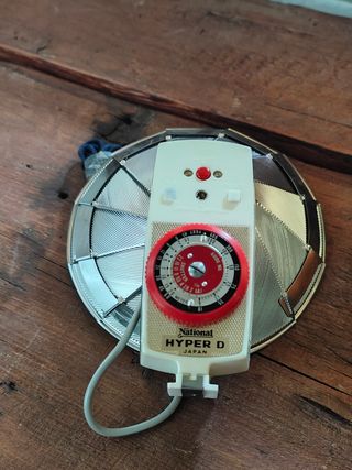 Flash a ventaglio National vintage in ottime condizioni. Praticamente nuovo perfetto per chi ama la fotografia retrò. - Flash National Japan Hyper D, con ghiera per la regolazione dell'intensità del flash. - Riflettore in metallo, con un design elegante e particolare.