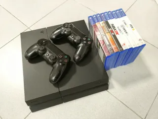 Console PlayStation 4 in colore nero, completa di due controller DualShock e una selezione di giochi. - Giochi inclusi: FIFA 16, FIFA 17, FIFA 19, W2K5, NBA 2K, WWE, Battlefield Hardline, Battlefield 1, MotoGP 15.