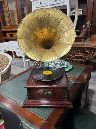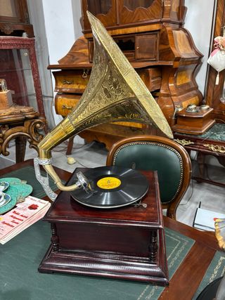 GRAMMOFONO IN LEGNO MASSELLO A CARICA A MANOVELLA FUNZIONANTE.CON TROMBA IN OTTONE!DIVERSO DAI SOLITI GRAMMOFONI DI BASSA QUALITA' CHE SI TROVANO SUL MERCATO. QUESTO GRAMMOFONO VI SORPENDERA' PER L'ACCURATEZZA CON IL QUALE E' REALIZZATO.MAX GARANZIA E SERIETA' ACQUISITA QUESTO STUPENDO GRAMMOFONO NOCE Tromba diam. 40cm. disco originale e puntine nuove di ricambio costa pochi euro in piu' di altri simili ma : -cassa con apertura a cerniera per controllo e lubrifcazione motore -manovella con blocco di ritorno molla. -meccanismo doppia molla resistentissimo -disco originale (non orientale)= -puntine nuove di ricambio