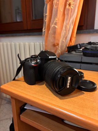 Macchina fotografica reflex di colore nero. - Obiettivo con tappo. - Tracolla inclusa.