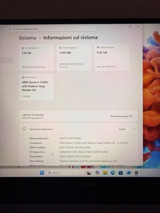 Notebook Honor MagicBook 15 con finiture eleganti. - Colore grigio/argento. - Tastiera QWERTY. - Touchpad ampio. -256 GB -windows 10 -touch id per accedere
