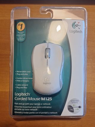 Mini mouse ottico Logitech M125 di colore bianco, con cavo USB estensibile e retraibile. EAN 5099206022140, modello M125 910-001837. Mai aperto, nella confezione originale. Tirando la spina si può allungare il cavo, facendolo uscire dall'alloggiamento interno. La lunghezza è regolabile, dunque non è necessario far uscire completamente il cavo. Per far ritrarre il cavo, tirarlo e lasciarlo andare per attivare la molla. Dotato di magnete per tenere la spina usb fissata sotto al mouse quando non viene utilizzato. Colore bianco e grigio. Le dimensioni molto approssimative del mouse sono 5,5 x 9 cm e 4 cm di altezza; la massima estension