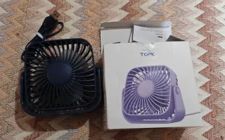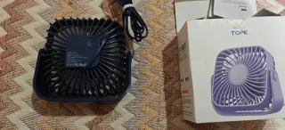 Ventola USB di colore blu. - Alimentazione tramite cavo USB. - Design compatto e portatile.