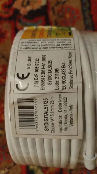 Cavo coassiale per segnali RF, ideale per installazioni in costruzioni ed opere civili. Progettato per limitare la diffusione del fuoco. - Classe A - 5,1mm di diametro - Lunghezza 25 m - Certificazione EN50575:2014+A1:2016 - EUROCLASS Eca - Sostanze Pericolose: None - Lotto: 211005 - Importato da: Deola Ivano, Verbania - Italy