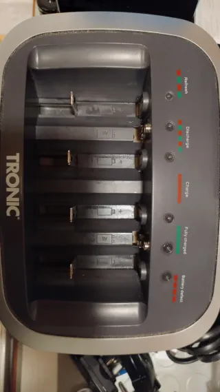 Caricabatterie per diverse tipologie di batterie. - Compatibile con batterie ricaricabili. - Indicatori LED per stato di carica e refresh. - Design compatto e funzionale.